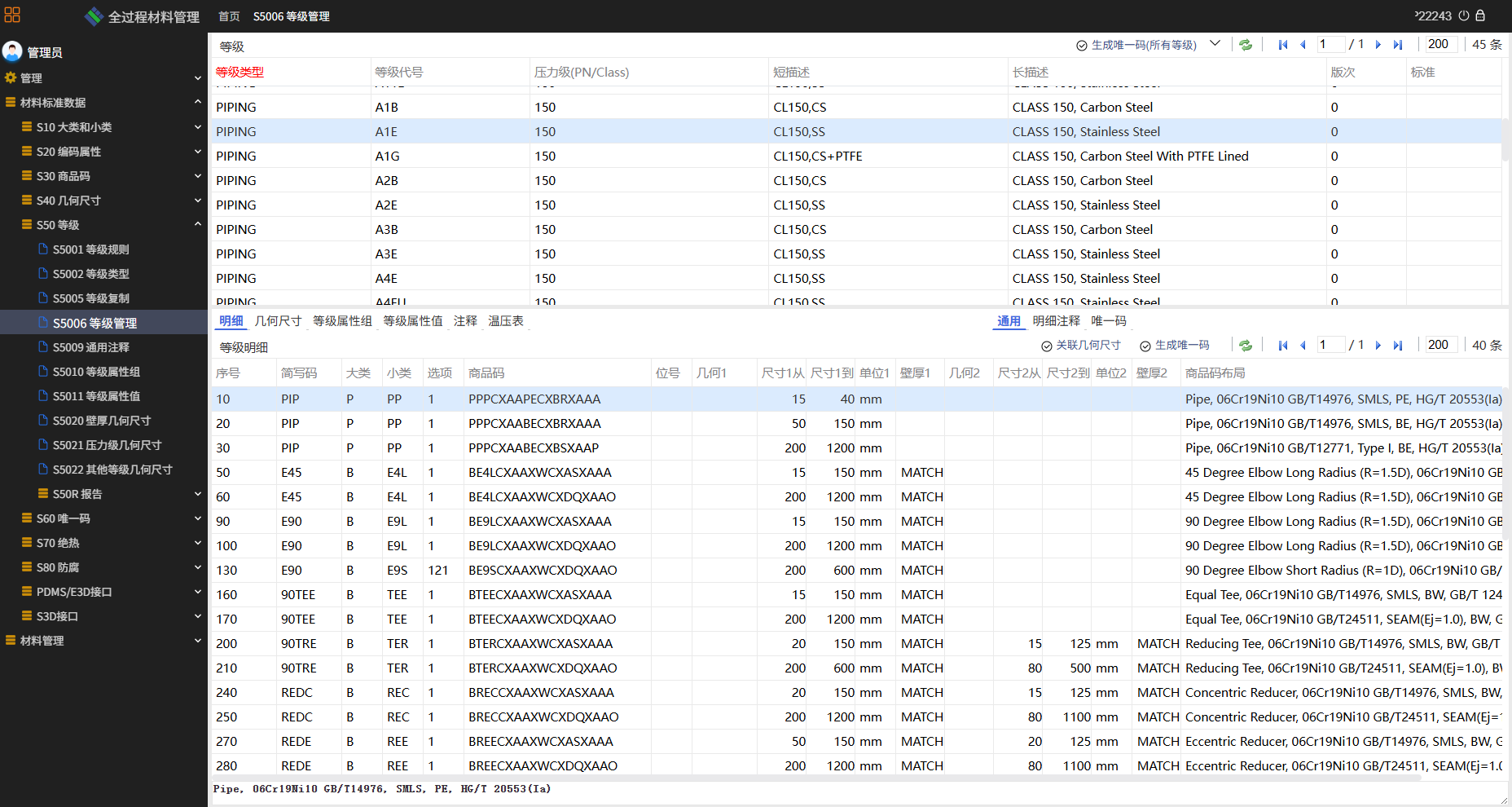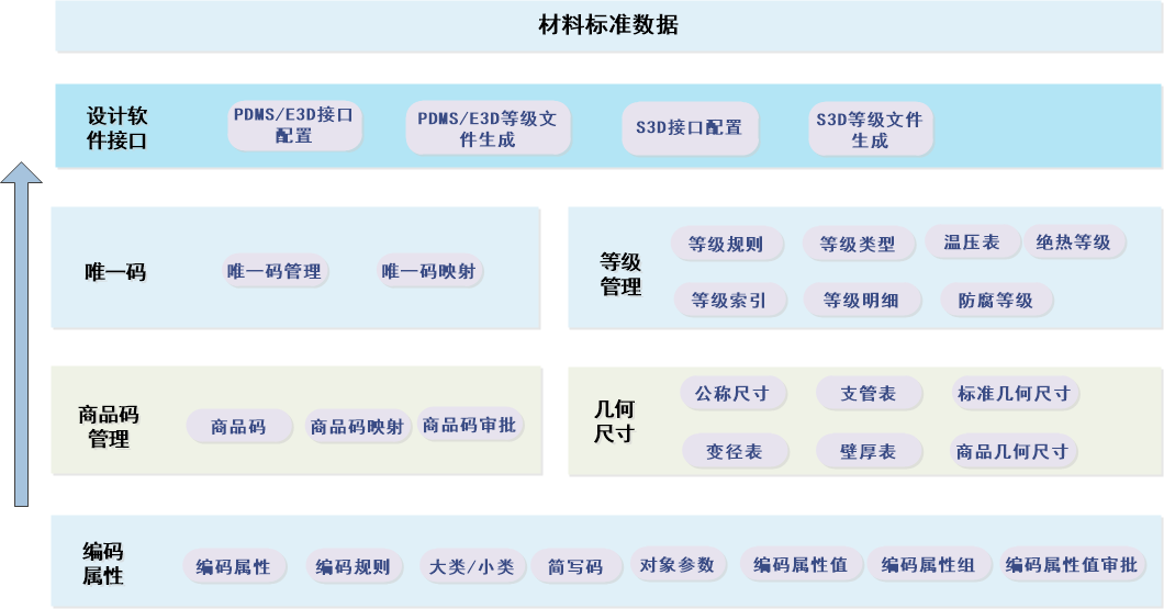 材料标准数据,是公司研发的标准材料数据库软件,实现全专业材料编码库、标准尺寸库、材料等级库、材料绝热和防腐的建立和维护,其作为设计、采购、材控、施工和运营检维修的数据基础,为三维设计提供可靠、系统的材料数据库,同时可将具有唯一编码的材料信息传递给材料管理平台对材料进行管理。
