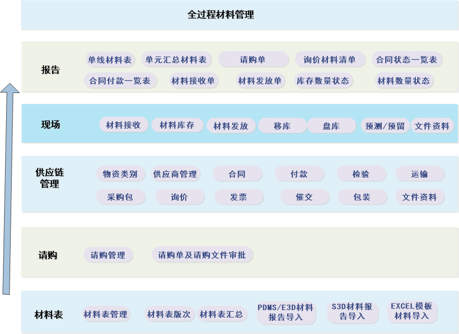 材料管理平台,主要用于EPC项目全生命周期的材料管理,能对项目建设过程中设计材料表、请购、询价、技术和商务评标、采买、催交检验、包装、运输、材料接收、仓库管理和材料发放进行管理的数据平台。可用于项目的全生命周期,从投标报价、基础设计、详细设计、采购阶段到现场施工阶段。